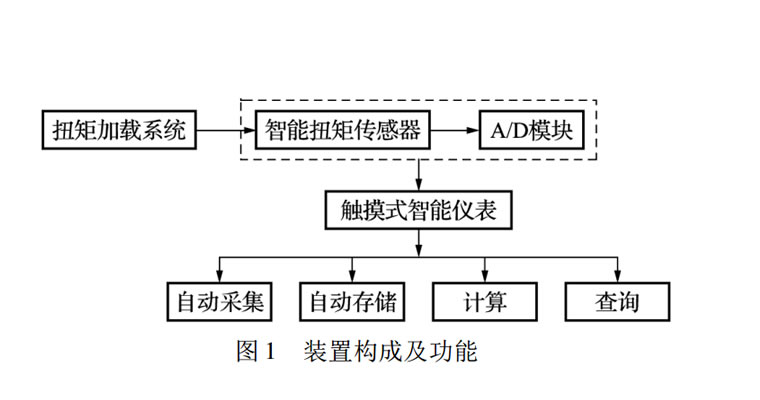 整個(gè)智能型便攜式電動(dòng)扭矩扳手校準(zhǔn)裝置由扭矩加載系統(tǒng)、智能傳感器和智能儀表等構(gòu)成, 如圖 1所示。自動(dòng)和手動(dòng)相結(jié)合的加載方式提高了工作效率,也節(jié)省了人力。智能傳感器采用低成本的 DALLAS2401 半導(dǎo)體芯片, 降低了生產(chǎn)成本, 可實(shí)現(xiàn)自動(dòng)識(shí)別功能。觸摸式智能儀表能實(shí)現(xiàn)峰值自動(dòng)采集、存儲(chǔ)計(jì)算和查詢功能,可在現(xiàn)場(chǎng)完全取代計(jì)算機(jī)。