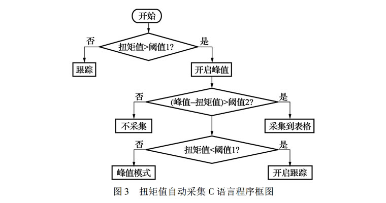 大多數(shù)儀表只具有顯示功能不具有數(shù)據(jù)采集和分析功能,校準(zhǔn)人員在校準(zhǔn)時(shí),一邊操作校準(zhǔn)裝置,一邊用筆記錄校準(zhǔn)數(shù)據(jù)。這樣不但工作效率低還容易出錯(cuò)。為了方便校準(zhǔn)員做記錄,儀表專門設(shè)計(jì)了數(shù)據(jù)采集功能,采集表格形式完全按照 JGJ707—2014《扭矩扳子檢定規(guī)程》的表格形式[7,這樣方便后面的計(jì)算和出證書。儀表采用具有C語言功能的觸摸屏作為顯示終端。校準(zhǔn)人員可以通過設(shè)定最大扭矩值和采集觸發(fā)值, 實(shí)現(xiàn)扭矩值的自動(dòng)采集。并根據(jù)采集數(shù)據(jù)進(jìn)行平均值和示值相對(duì)誤差和示值重復(fù)性的計(jì)算。C 語言程[8]框圖如圖3 所示。其中閾值1表示進(jìn)入峰值模式的判斷條件,閾值2表示采集峰值判斷條件。當(dāng)扭矩值超過閾值 1,儀表自動(dòng)從跟蹤模式變?yōu)榉逯的J健.?dāng)峰值和當(dāng)前的扭矩值之差大于閾值 2 時(shí),程序會(huì)將峰值自動(dòng)采集到表格中,然后解除峰值功能。閾值1和2的設(shè)定根據(jù)智能傳感器的量程來計(jì)算得到。本設(shè)備中閾值1為傳感器滿量程值的5%,閾值2為滿量程值的2/3。