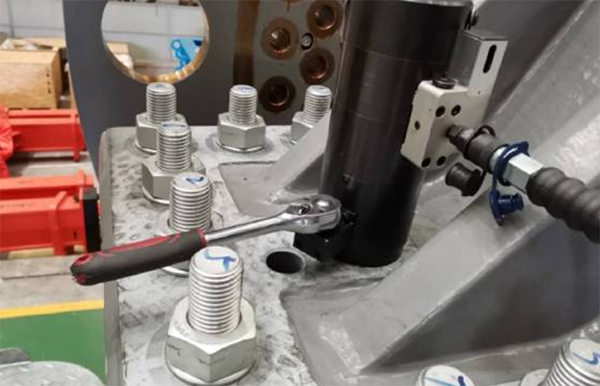 當拉伸器安裝到位后,再次用手動扭矩扳手順時針旋轉齒輪箱四方驅動裝置,保證螺母與接觸面達到預緊,安裝完成。之后,重復以上操作安裝其他拉伸器并用高壓油管互相連接 之后就可以連接超高壓泵站調至需要拉伸多力對應設定的壓力開始拉伸。